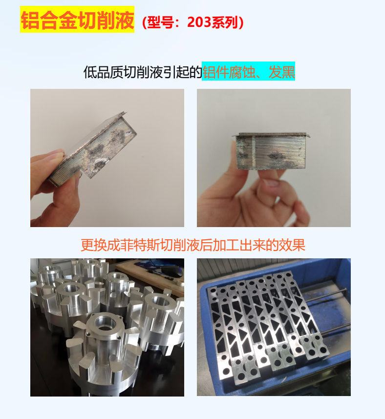 7系铝切削液采用了高效的铝合金腐蚀抑制剂,用于敏感7系铝的切削,能有效阻止7系铝表面变色、生斑等腐蚀现象。