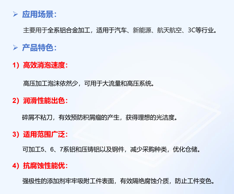 优秀的铝防腐蚀性能,提供优良的润滑,表面光洁度和刀具寿命。