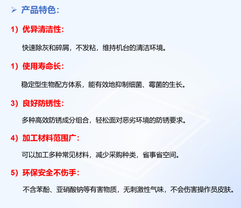 适用范围广,可用于多种材料和多种加工方式,减少切削液产品种类。