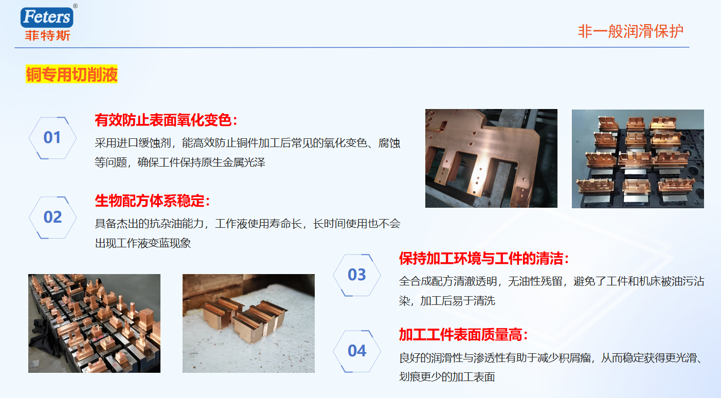 菲特斯铜切削液是由精制矿物油、水溶性防锈剂、表面活性剂以及特种添加剂组成,具有良好的生物稳定性、润滑性和防锈性;