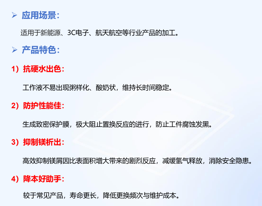 1、优异的镁合金保护性能:采用先进的中性配方体系,良好的镁合金保护性;